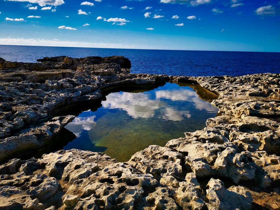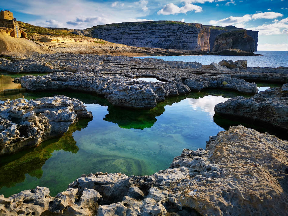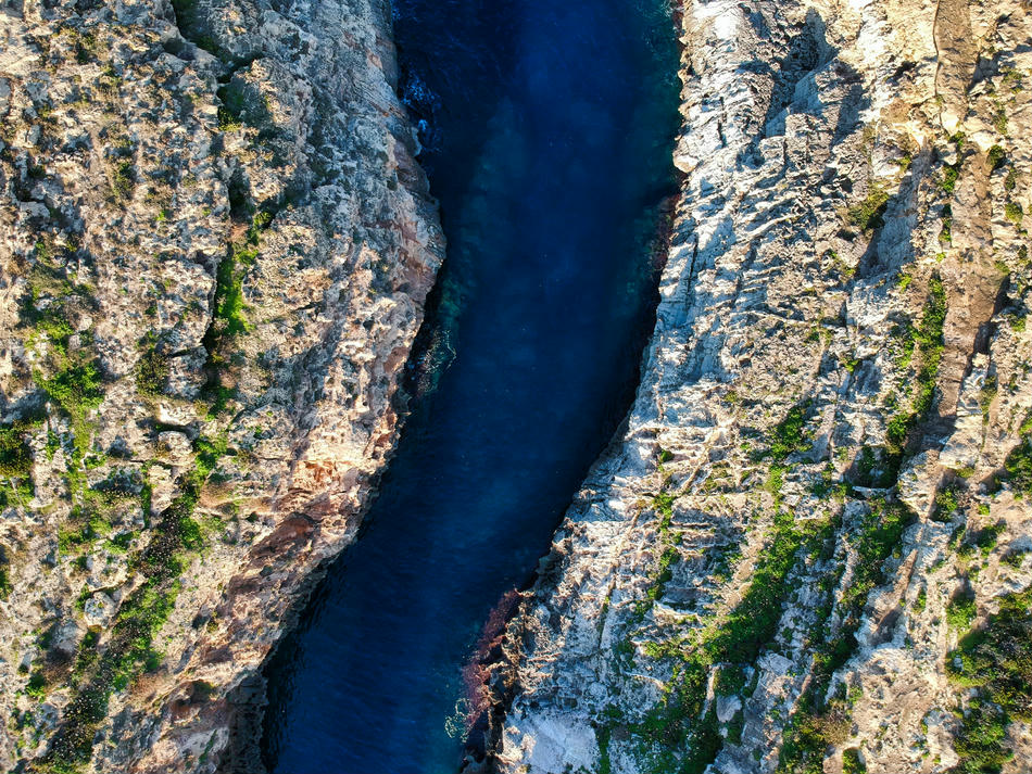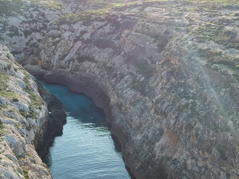 Als nächstes sind wir wieder in den Norden von Gozo gefahren, dessen Besuch wir ja leider an Heiligabend abbrechen mussten, weil es dunkel wurde. Unser erstes Ziel im Norden war der Canyon. Hier befindet sich eine tiefe Schlucht mit tiefblauem Wasser.